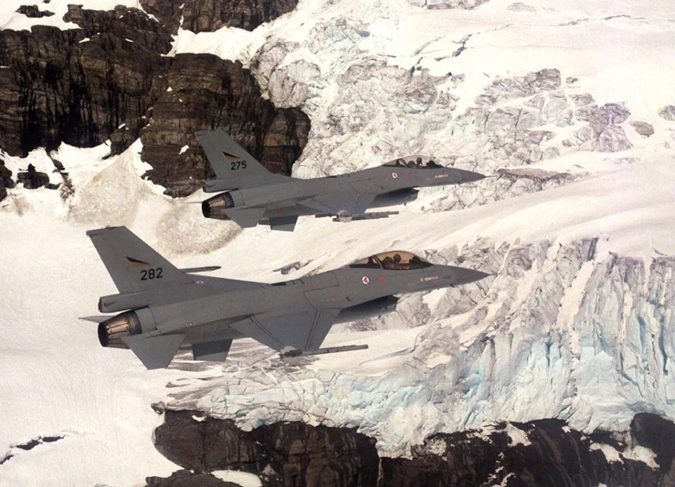 F-16A 282 og 275 over Østre Leirbotenskåki på Hardangerjøkelen, 19 mai 1993 Foto Rudolf Holm Rygge hovedflystasjon